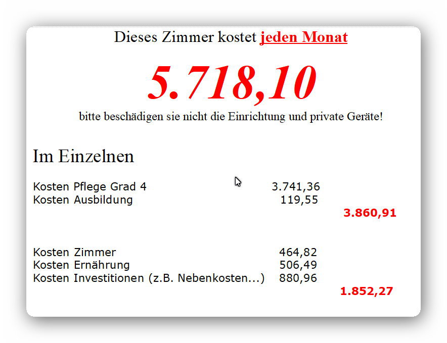 Der Schock ist wieder da. Man zeigt mir wieder auf, was ich für mein kleines Zimmer im Pflegeheim zahlen muss.